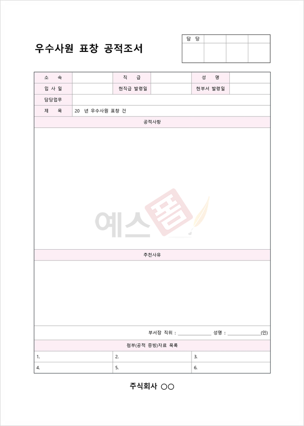 | 공적조서 서식(주요경력) | 공적조서 서식(포상 내역) | 우수사원 표창 공적조서 양식 |
