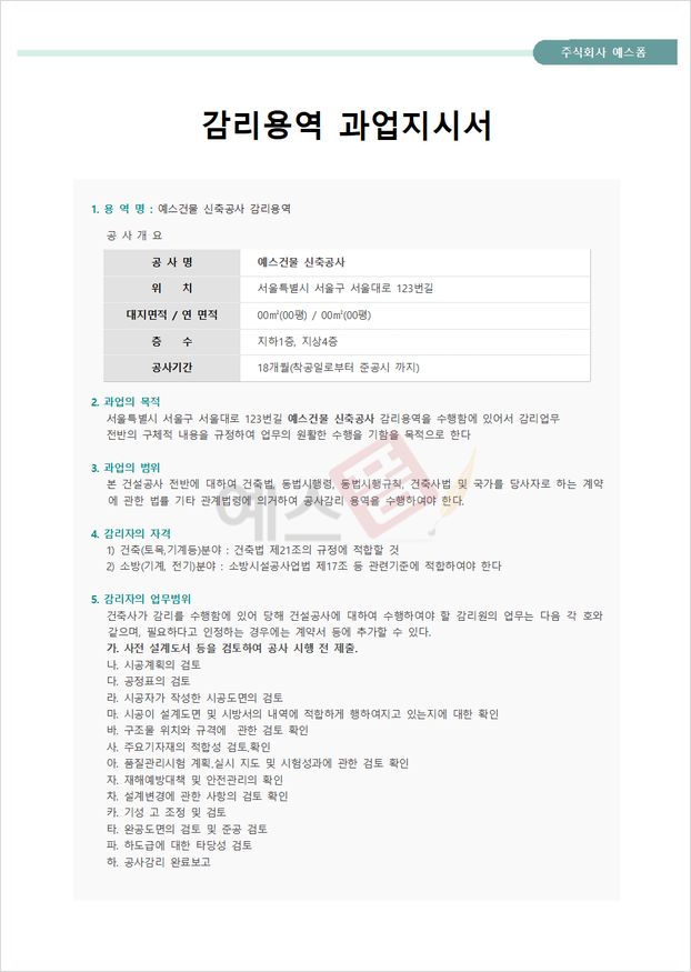 신축공사 감리용역을 수행하기 위한 감리용역 과업지시서 양식 및 과업지시서 예시입니다. 공사의 개요, 감리 과업의 목적, 범위 등을 규정하고 있는데요. 이를 통해 감리용역이 원활하게 수행될 수 있도록 하는 것이 목적이며, 건축사법 및 국가를 당사자로 하는 계약에 관한 법률, 기타 관계법령을 준수하여 공사감리 용역을 수행합니다.