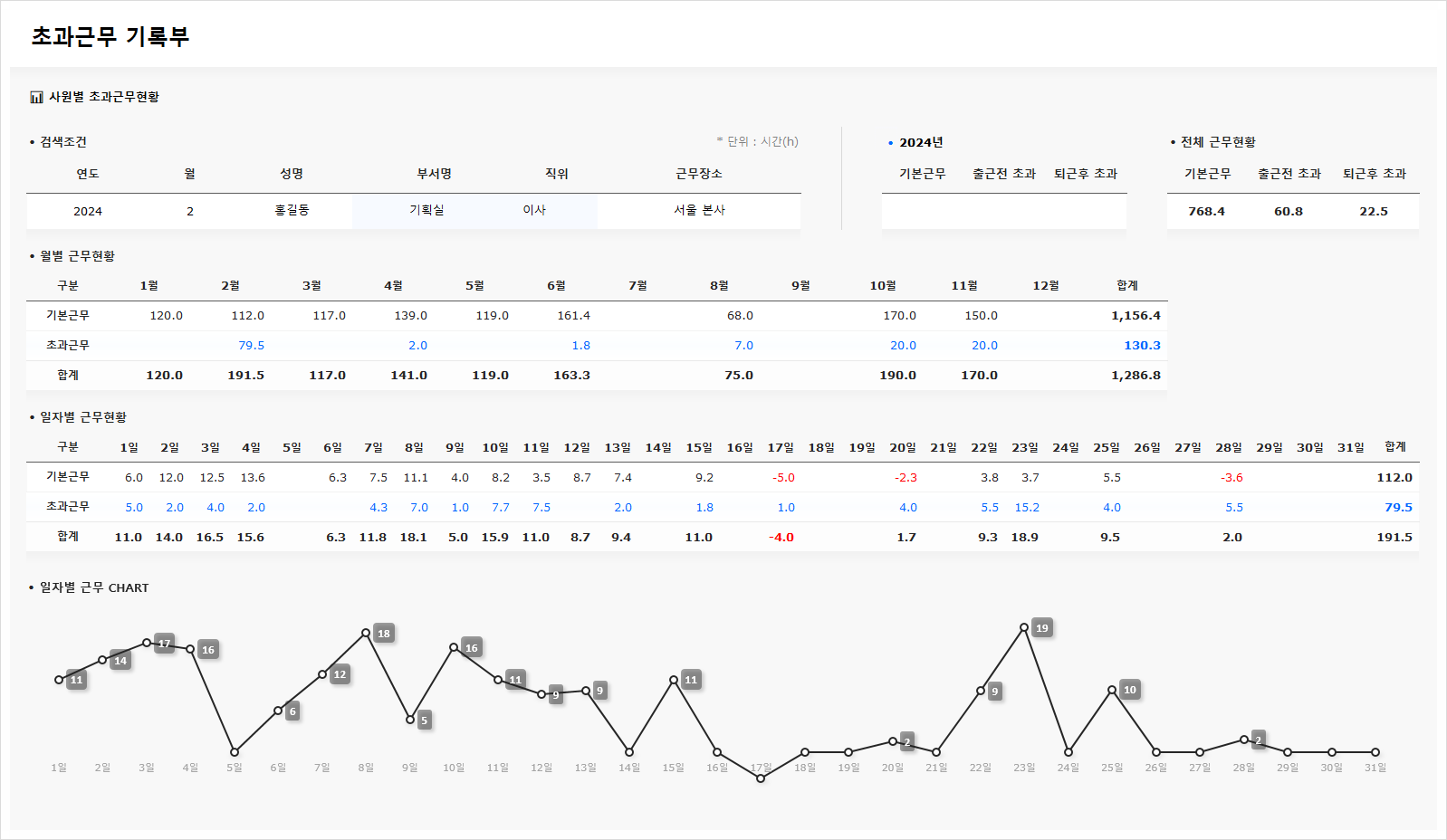 사원별 초과근무, 출근전 초과근무, 퇴근후 초과근무 등 연장근로시간을 초과 인정 시작 일자 및 종료 일자를 통해 근무 장소별 초과근무 시간을 자동으로 연도별/월별/일자별 현황 과 그래프로