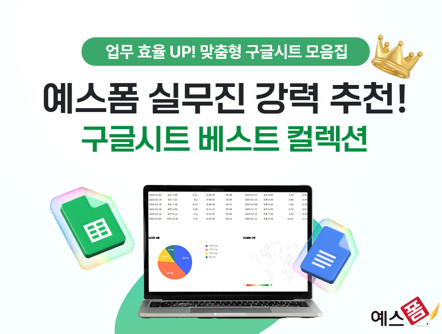 구글 스프레드시트를 더 효율적으로 쓰는 가장 쉬운 방법은 ‘목적에 맞는 템플릿 활용’입니다. 데이터 자동 계산, 시각화, 실시간 공유까지 가능한 템플릿은 업무 생산성을 빠르게 높여줍니다. 예스폼은 실무에서 자주 사용되는 구글 스프레드시트 템플릿만을 골라 엄선한 '베스트 컬렉션'을 제공합니다.