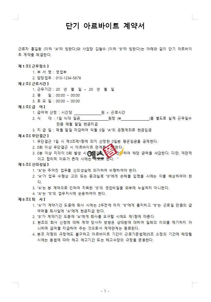 👇🏻아르바이트(단기간) 근로계약서 양식 바로 가기👇🏻