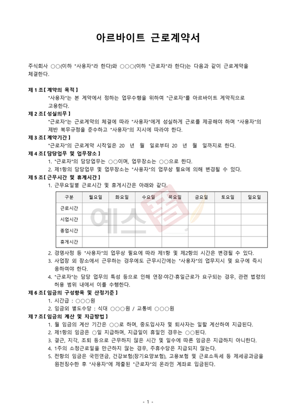 고용노동부에서 표준근로계약서를 배포하고 있지만, 근로 형태와 업종에 따라 다양한 근로계약이 존재하기 때문에 표준근로계약서를 현장에 그대로 적용하는 것은 어려움이 있는데요. 예스폼에서 서비스하고 있는 상황별 근로계약서 양식을 참고하셔서 우리 사업장에 맞는 근로계약서 양식을 만들어보시기 바랍니다.