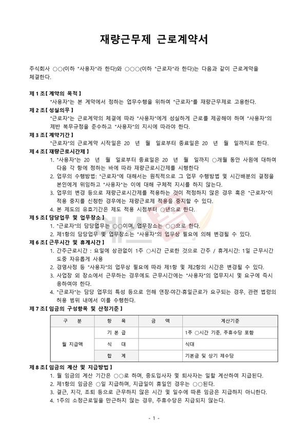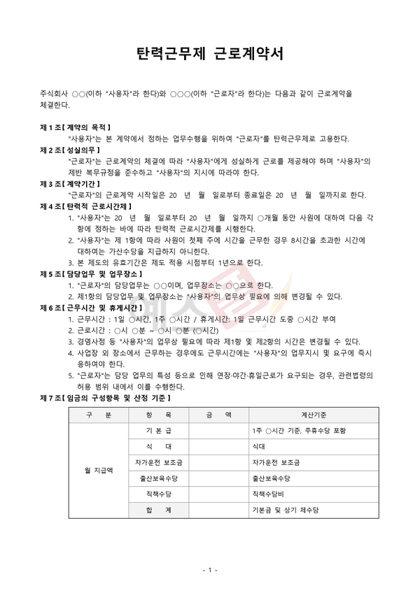 | 2주 단위 탄력근무제 근로계약서 | 재택근무제 근로계약서 | 재량근무제 근로계약서 |