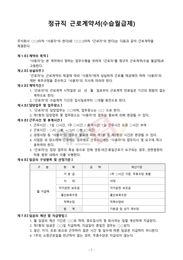 근로계약서는 법적으로 정해진 양식이 있는 것은 아니지만, 앞서 말씀드린 것처럼 근로기준법에 의해 반드시 명시해야 하는 항목들이 있으며 이에 더해 구체적인 근로조건을 명시해야 추후 발생할 수 있는 분쟁의 소지를 줄일 수 있습니다.