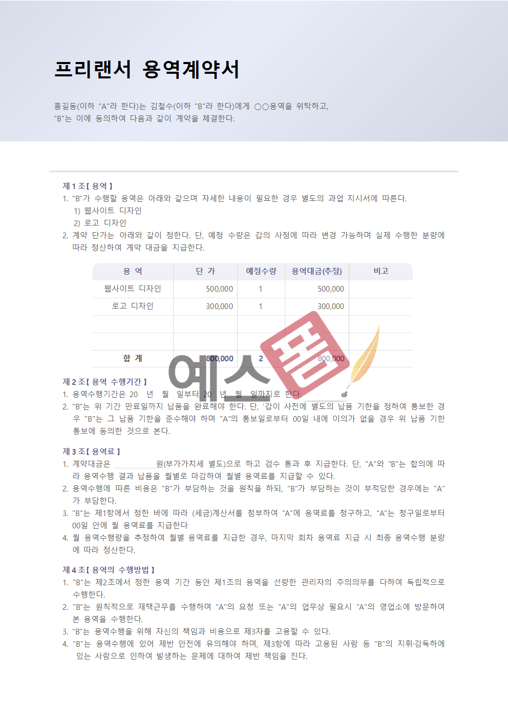 | 프피랜서 용역계약서 | 개발 용역계약서 | 연구 용역계약서 |