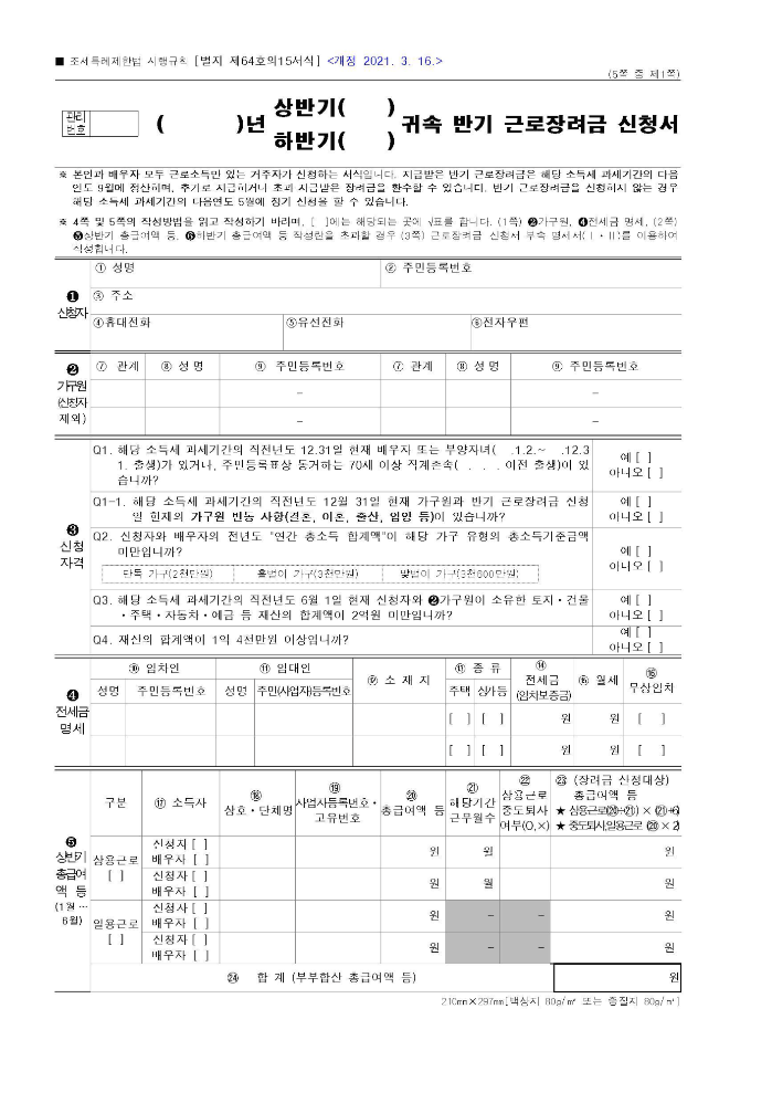 (상반기, 하반기) 귀속 반기 근로장려금 신청서
