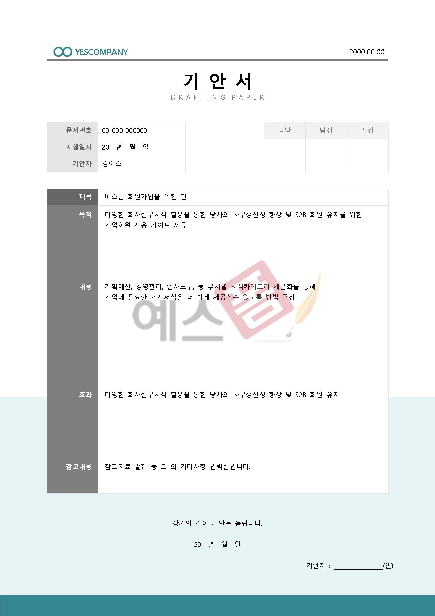 직장인 분들을 위해 예스폼에서는 다양한 기안서 관련 양식을 서비스하고 있습니다. 영문기안서, 급여인상기안서, 동호회기안서 등 다양한 양식을 활용해 보시기 바랍니다.