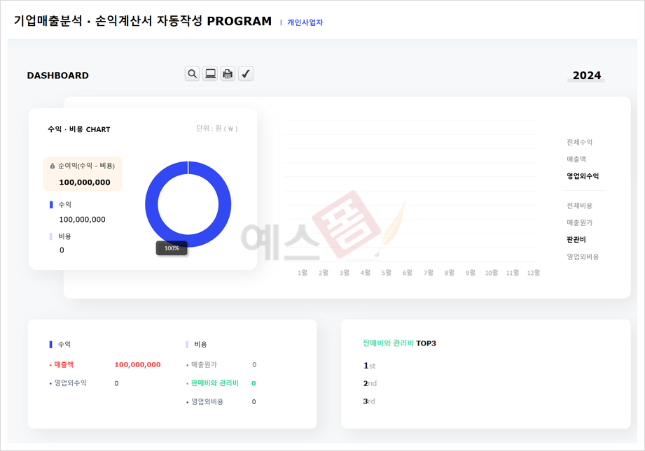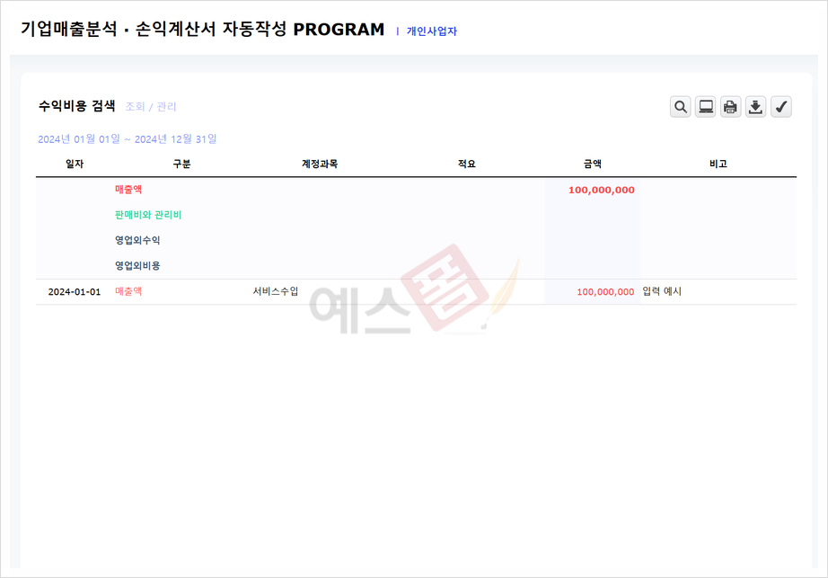 기업매출분석/손익계산서 자동작성 엑셀 프로그램 개인용(수익/비용, 판관비, 실적관리) - 예스