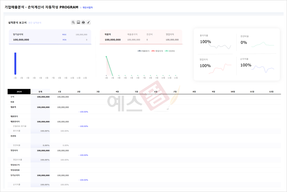 기업매출분석/손익계산서 자동작성 엑셀 프로그램 개인용(수익/비용, 판관비, 실적관리) - 예스