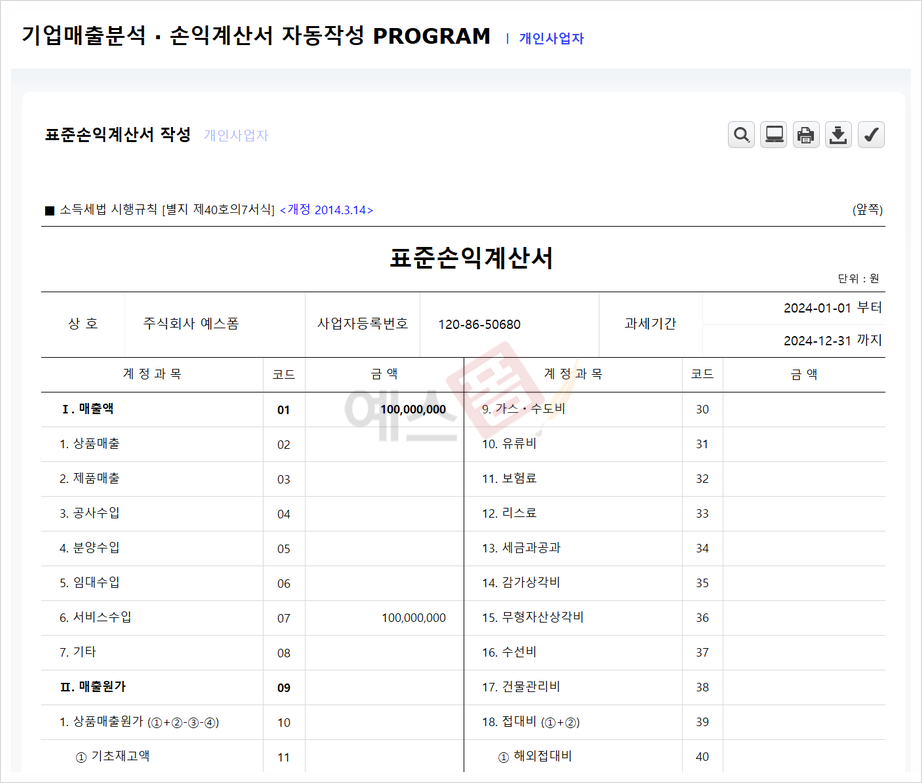입력된 내용을 바탕으로 표준 손익계산서(개인/법인) 양식이 자동으로 작성되는 시트입니다.