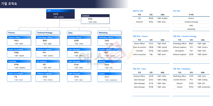 각 부서별 임직원의 정보를 한눈에 확인할 수 있는 기업 조직도 엑셀 양식입니다.
