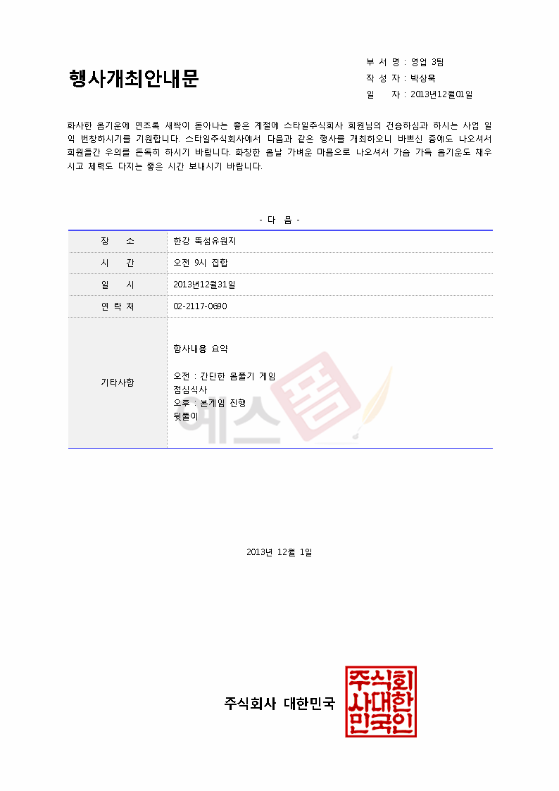- 행사 세부 정보 : 행사명, 목적, 일시, 장소, 참가 대상, 진행 순서 등