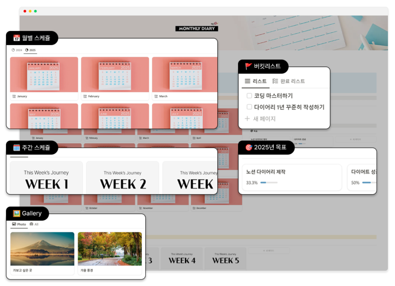 노션 다이어리 템플릿 2025 추천! 캘린더 · 데일리 노트 · 위클리 플래너 · 먼슬리 다이어리