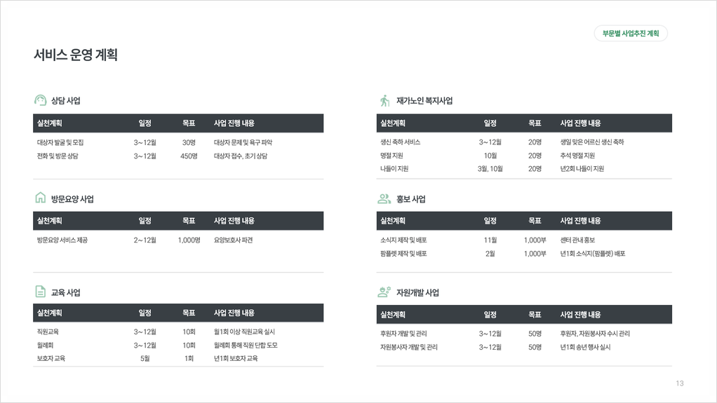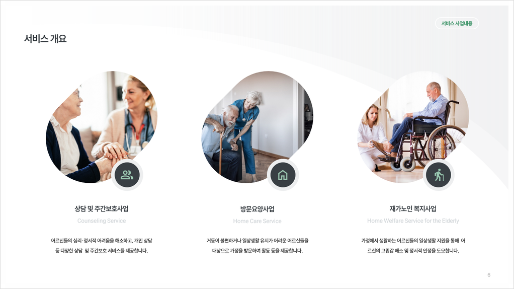 | 재가 노인복지센터 사업계획서 | 노인 재교육기관 설립제안서 | 노인 의료복지시설 사업계획서 |