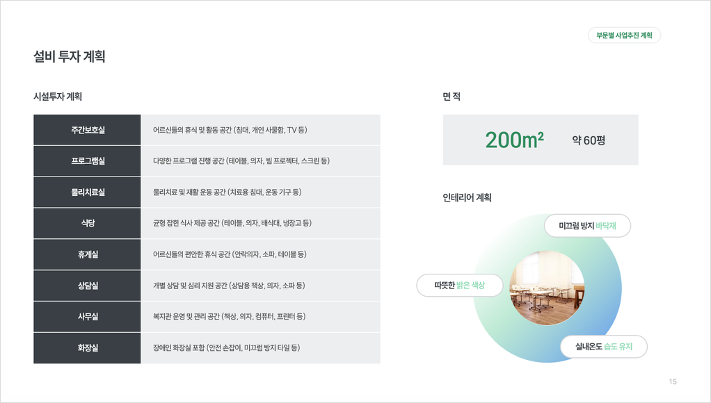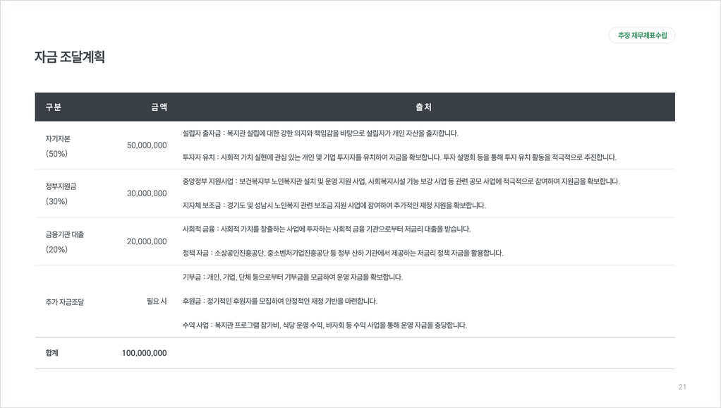 사업장은 노인 인구 밀집 지역에 위치하며, 대중교통 접근성이 용이하고 주변 편의시설이 확보된 곳으로 선정할 계획입니다. 시설 투자 및 운영 자금은 설립자 출자금, 투자자 유치, 정부 지원금, 금융기관 대출 등을 통해 조달할 예정입니다.