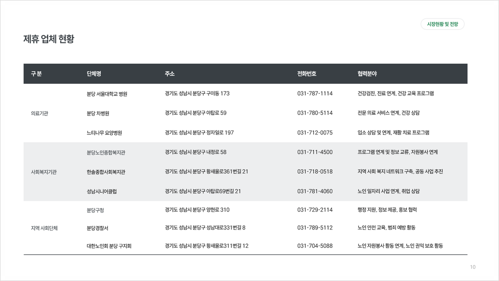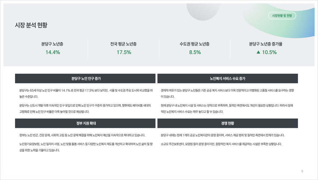 (주)행복한 실버케어에서 분당 지역 노인복지센터 설립을 계획하고 있습니다. 분당구의 노인 인구는 지속적으로 증가하고 있으며, 정부의 노인복지 예산 확대와 고품질 서비스에 대한 수요 증가로 시장 전망이 밝습니다.
