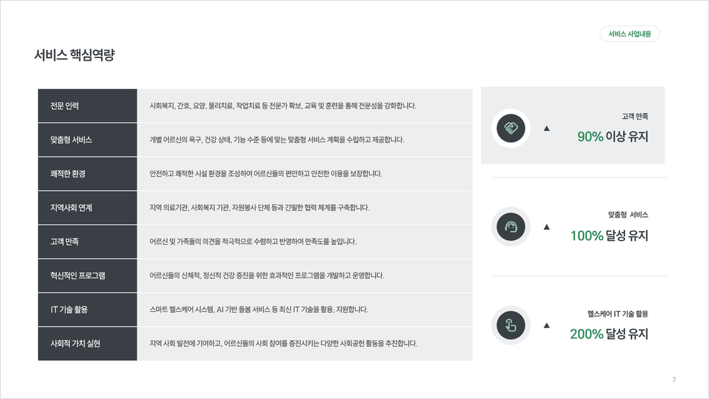 본 센터는 주간보호센터, 방문요양, 방문목욕 등 다양한 서비스를 제공하며, 전문 인력 확보, 맞춤형 서비스, 쾌적한 환경, 지역사회 연계를 통해 어르신들의 건강하고 행복한 노후를 지원합니다. 또한, IT 기술을 활용하여 스마트 헬스케어 시스템 등 혁신적인 서비스를 제공할 예정입니다.