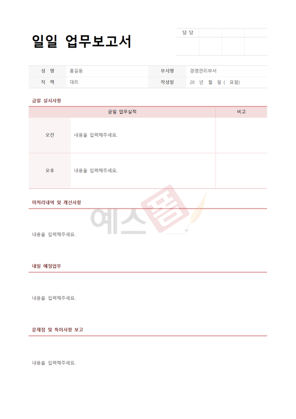 업무일지의 양식은 회사의 특성과 업무 효율성을 높이기 위하여 언제든지 자유롭게 변형할 수 있으나 자유롭게 양식을 구성하더라도 작성자 정보, 업무의 진행 현황, 업무계획은 반드시 포함되어야 업무일지의 목적에 부합될 수 있습니다. 예스폼 업무일지 양식을 참고하시고 우리 회사에 맞는 업무일지 양식을 작성해보시기 바랍니다.
