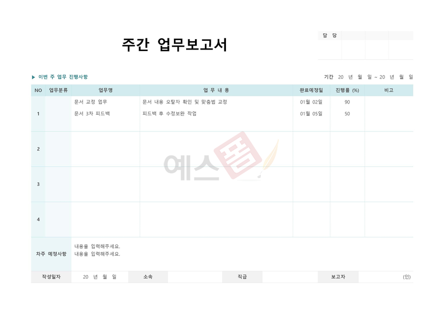| 일일 업무보고서 (문제점 및 개선사항) | 주간 업무보고서 (차주 예정 업무기재) | 주간 업무보고서 (업무달성률 쟁점사항) |
