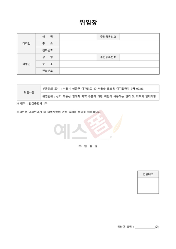 앞서 말씀드린 것처럼 위임장으로 위조하는 것을 방지하기 위해 위임장에서 사용한 인감을 증명하는 인감증명서를 위임장과 같이 첨부하는 것이 일반적인데요. 이때 위임장에는 반드시 인감증명서와 동일한 도장을 날인하여야 합니다.