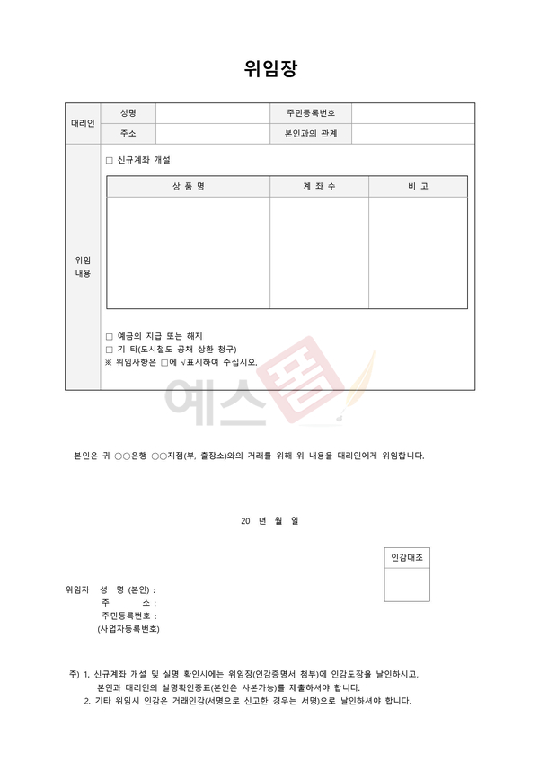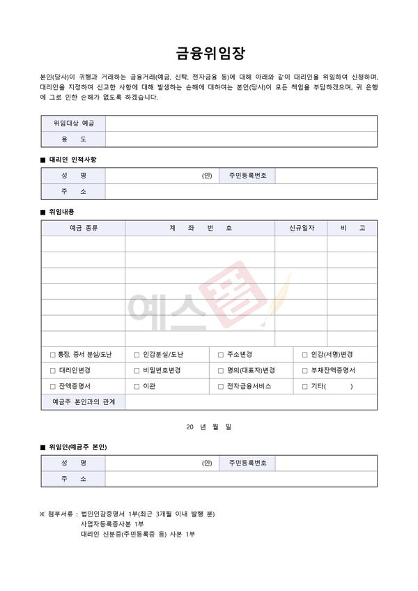 | 은행거래 위임장 | 금융 위임장 (예금) | 위임장 (신규 계좌 개설) |