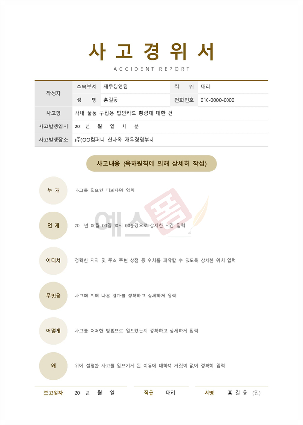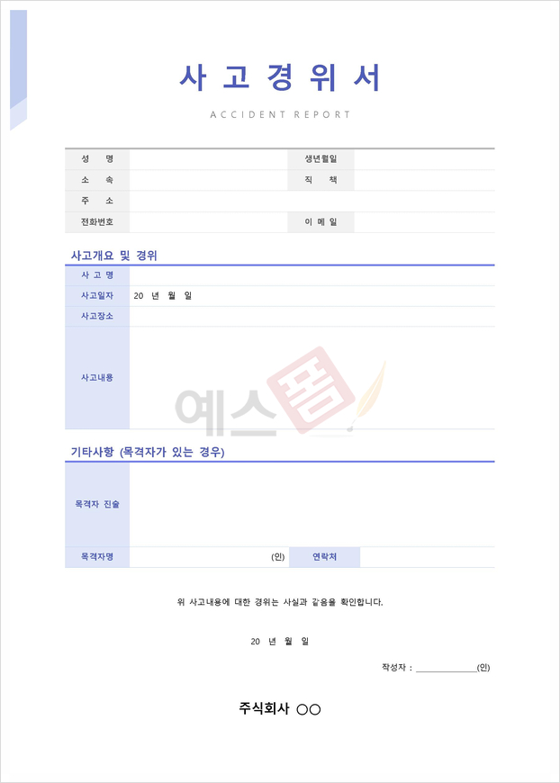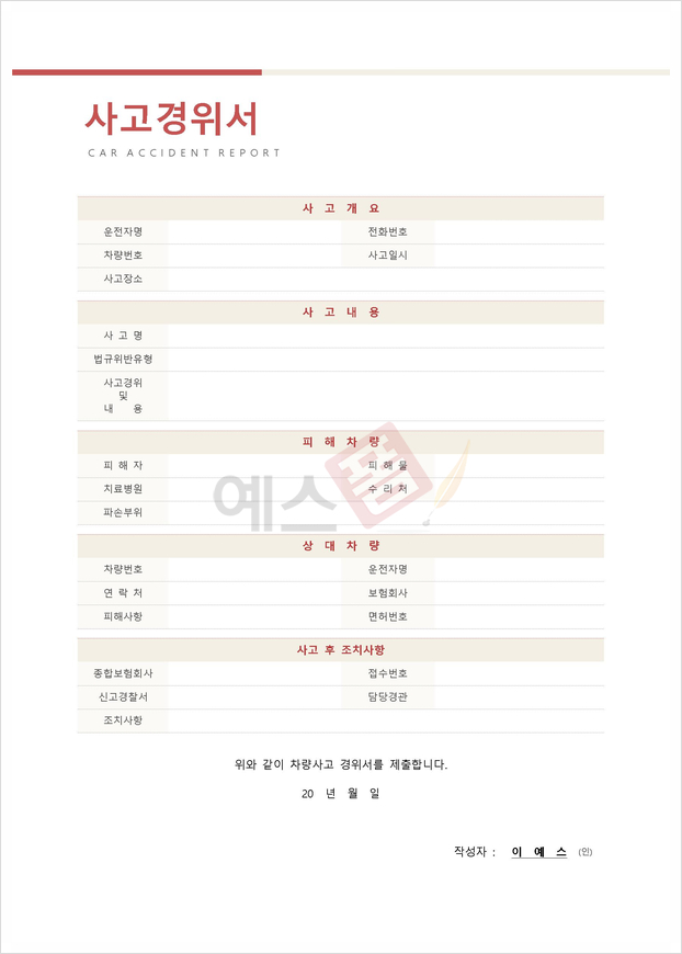 | 횡령사고 경위서 | 사고경위서 (목격자 진술 포함) | 차량사고 경위서 |