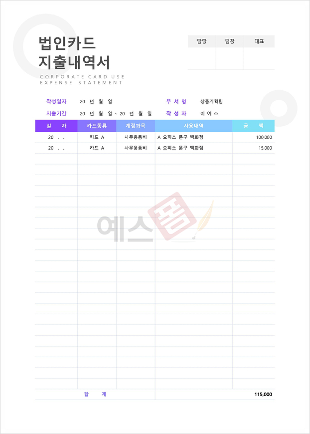 | 수입 및 지출내역서 | 법인카드 지출내역서 | 일일 경비지출내역서 |