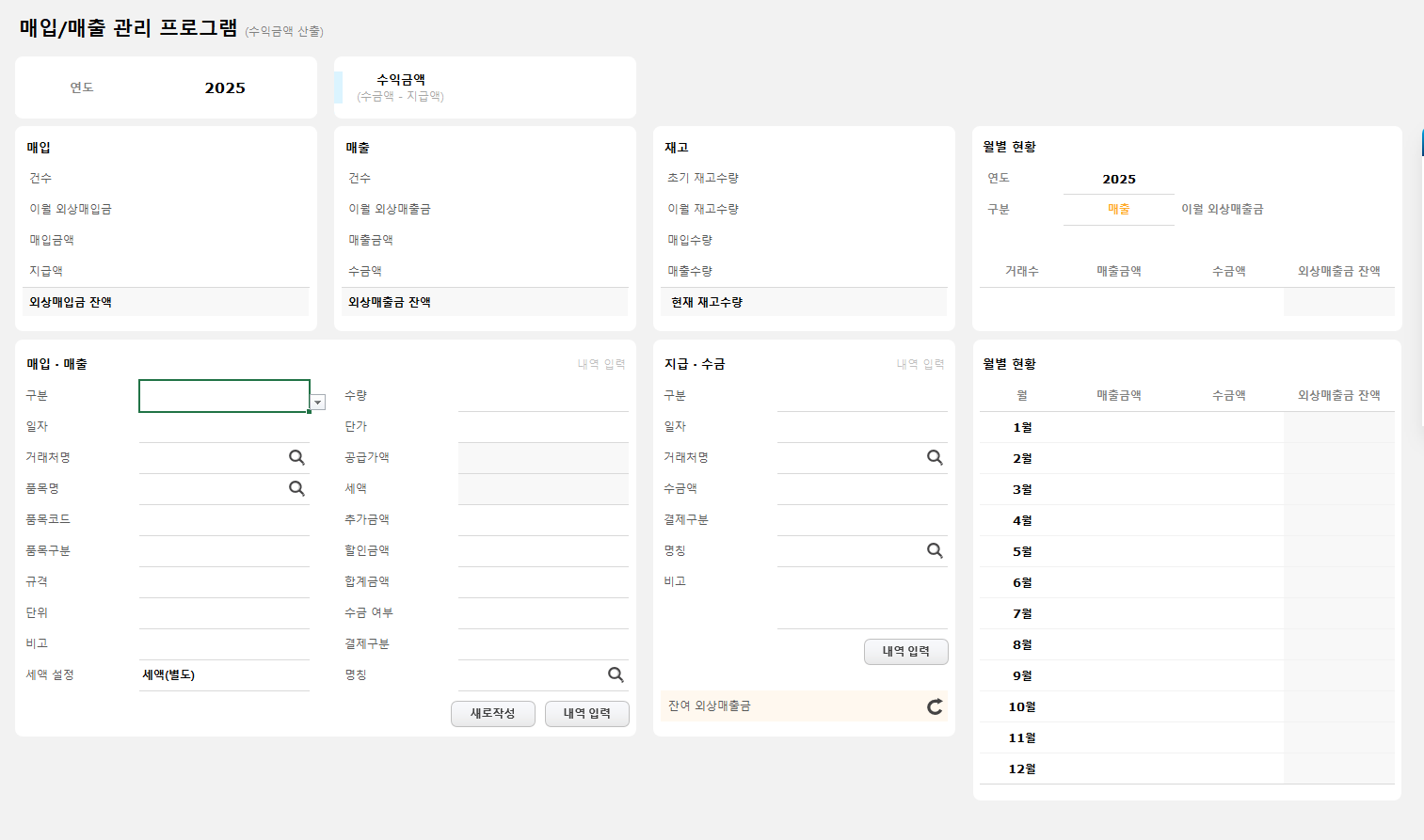 매입매출 프로그램은 사업자가 거래한 매입(구매) 내역과 매출(판매) 내역을 체계적으로 기록하고 관리할 수 있도록 도와주는 관리 도구입니다. 간단히 말해, 누구나 쉽게 매입과 매출을 구분해 기록하고, 수익 및 외상 현황까지 한눈에 파악할 수 있게 도와주는 자동화된 스프레드시트입니다.
