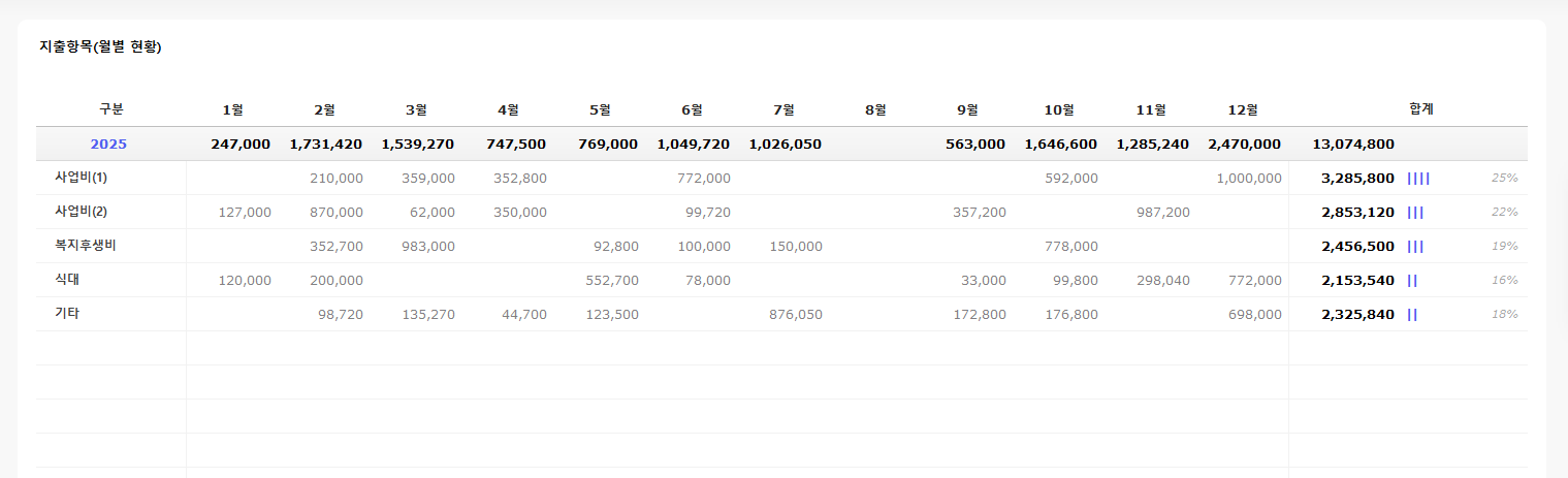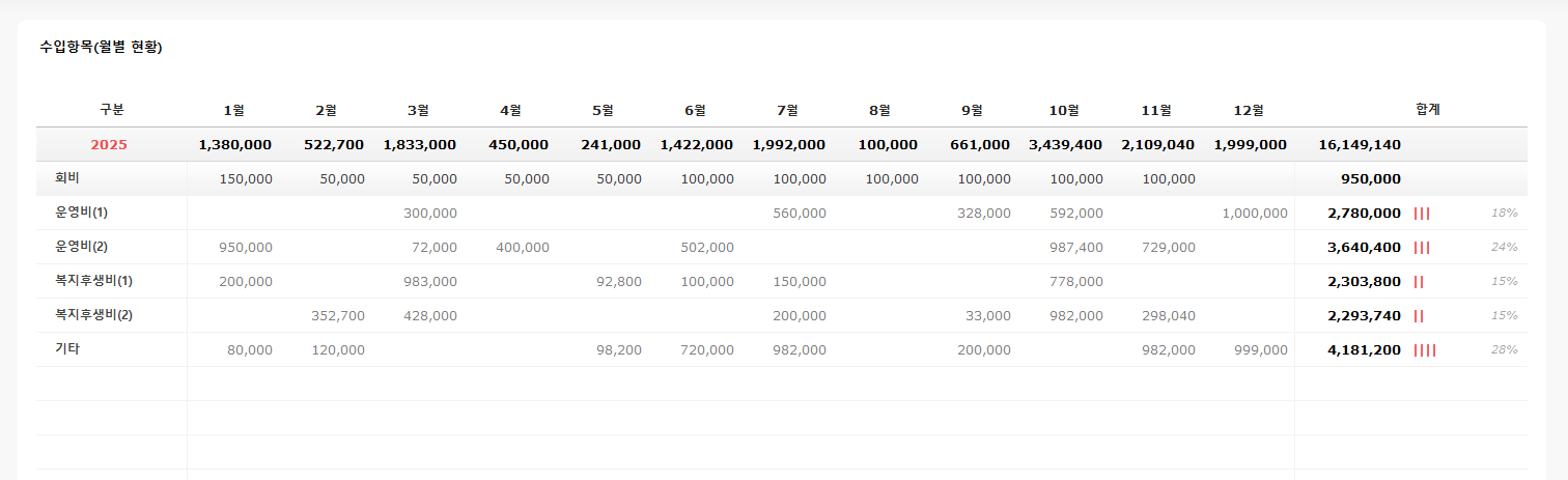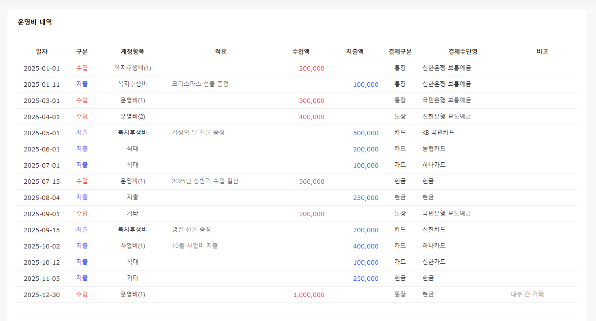 운영비 내역의 일자, 구분, 계정과목을 설정하여 수입 지출액을 입력할 수 있습니다. 결제구분, 명 설정이 가능합니다. 운영비 사용 사유와 어떤 결제 수단으로 언제 사용을 진행하였는지 관리가 가능합니다.