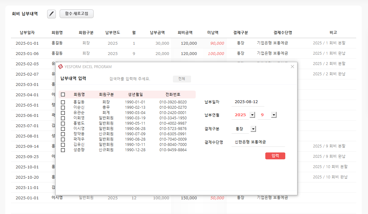 예스폼 모임 운영비 관리대장 (회비관리)