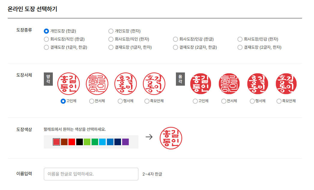 2️⃣ 실물 같은 고품질 전서체, 행서체, 흑묘안체, 고인체 등 실제 도장에서 많이 사용되는 폰트를 제공하여 실물과 구별하기 어려울 정도로 퀄리티가 높습니다. 도장 색상, 음각/양각 선택 등 세밀한 옵션 조정도 가능하죠.
