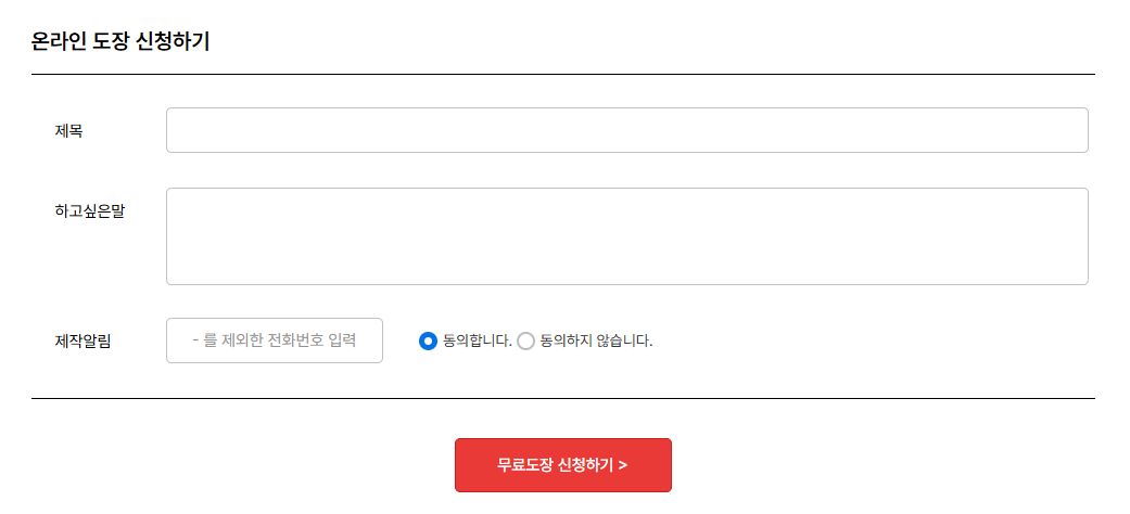간단한 제목과 신청 내용을 입력한 후 [무료도장 신청하기] 버튼을 클릭하여 제출합니다. 제작 완료 알림을 받고 싶다면 전화번호를 입력하는 것도 좋습니다.