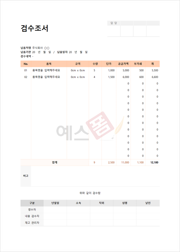 물품을 검수하고 물품의 규격, 수량, 품질 등의 검사 내용을 작성하는 서식