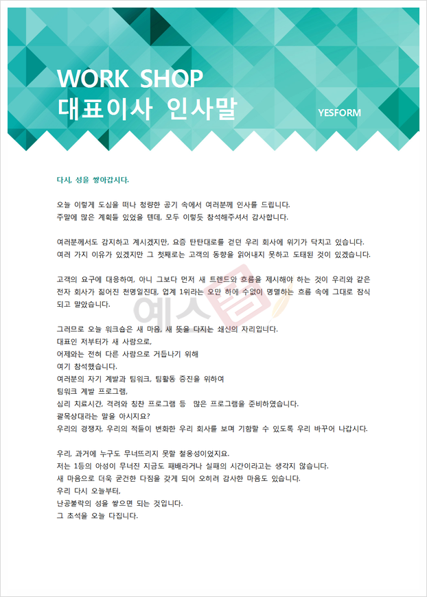 | 워크샵 휴무 안내문 | 워크샵 대표이사 인사말 |