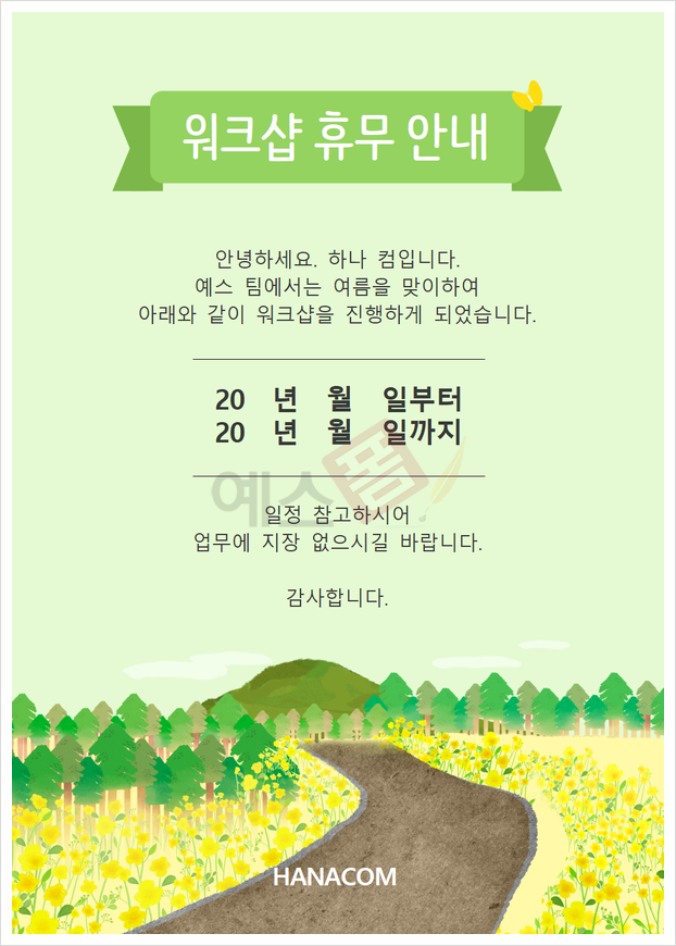 | 워크샵 휴무 안내문 | 워크샵 대표이사 인사말 |
