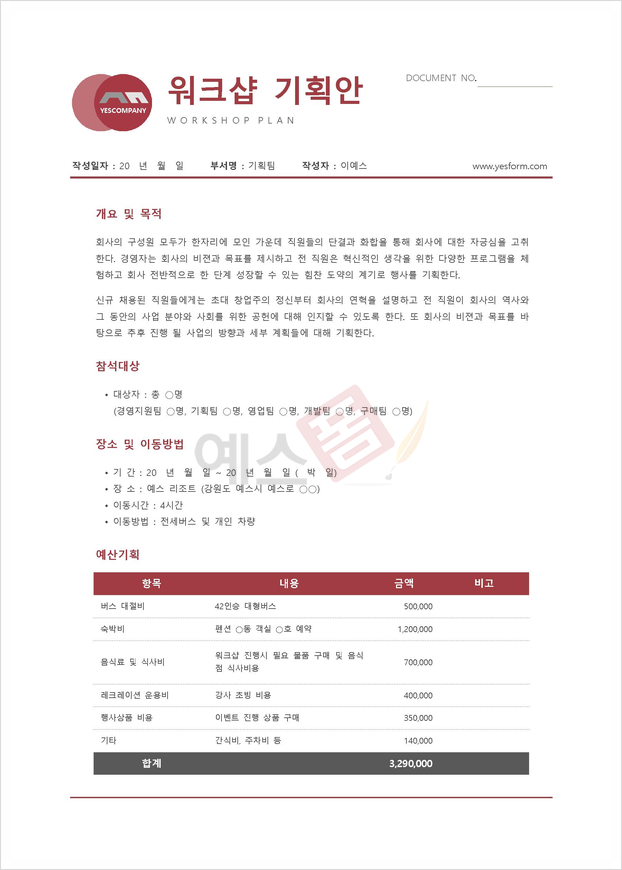 봄맞이 체육대회나 워크숍 같이 여러 인원이 참가하는 행사의 경우에는 보다 원활한 행사 추진을 위하여, 계획서를 작성하여 준비하는 편이 더욱 질서 있는 행사를 만들 수 있는데요. 오늘은 예스폼과 함께 봄맞이 워크샵과 체육대회를 준비하기 위한 다양한 서식들을 함께 만나보도록 하겠습니다.