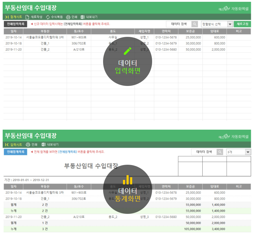 부동산 임대 수입대장도 마찬가지로 조건별 검색과 자동합산 기능이 있으며, 월계와 누계를 간편하게 확인하실 수 있습니다.