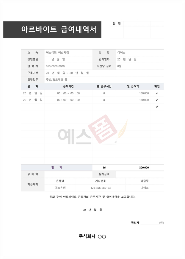 | 아르바이트 급여 산출명세서 | 아르바이트 급여내역서 | 일별 거래명세서 |