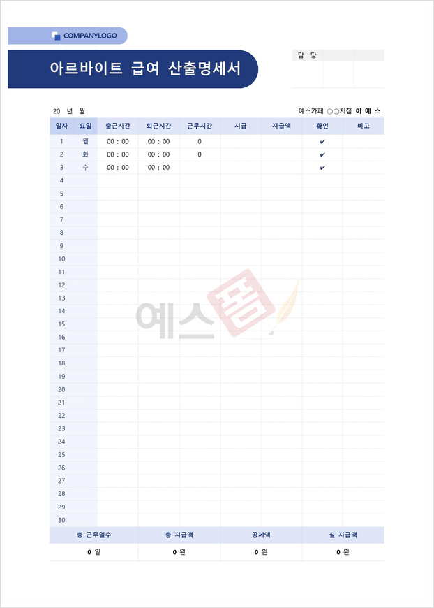 | 아르바이트 급여 산출명세서 | 아르바이트 급여내역서 | 일별 거래명세서 |