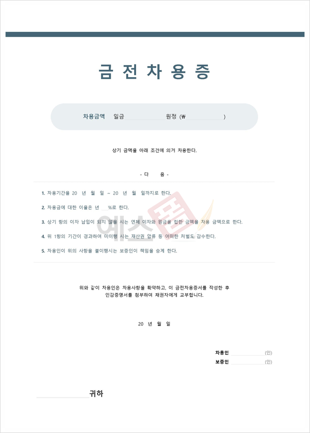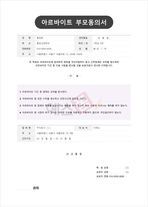| 금전차용증(보증인 서명) | 아르바이트 부모님 동의서 | 아르바이트 계약서 |