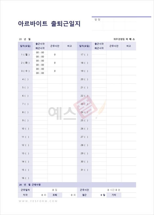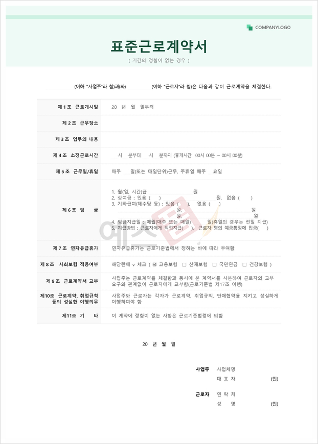 | 표준근로계약서(기간의 정함이 없는 경우) | 연봉계약서 | 아르바이트 출퇴근일지 |