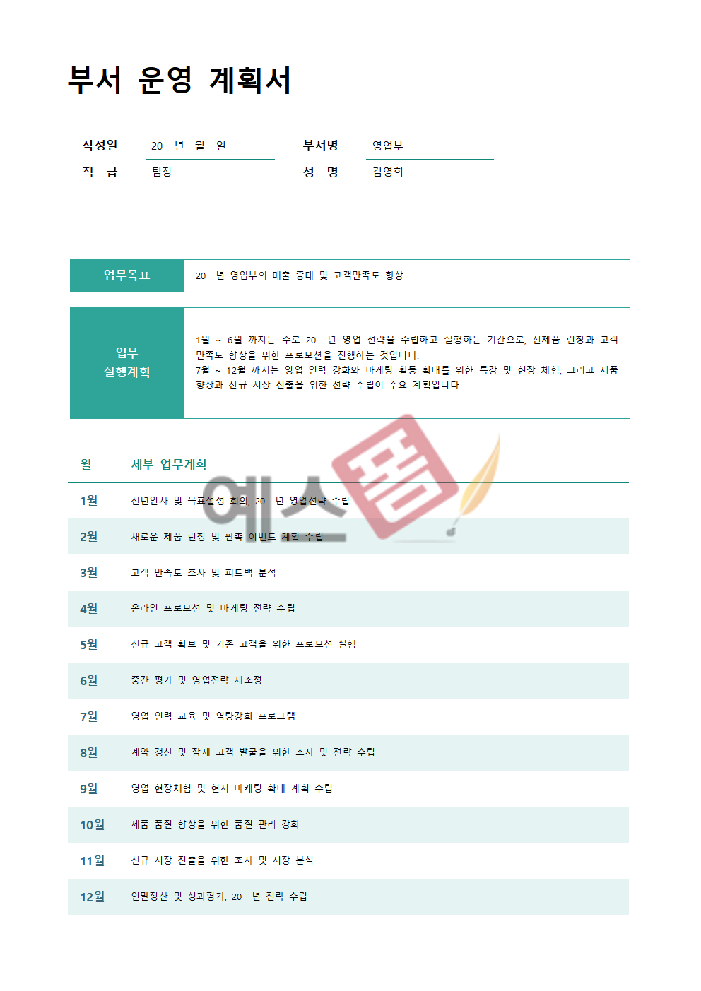 다양한 문서서식을 한 눈에!! '부서운영계획서' 국내 1위 문서서식 플랫폼 예스폼 통합검색의 결과 입니다. 계약서, PPT, 사업계획서, 회사문서, 엑셀 프로그램등 다양한 문서서식을 경험해 보세