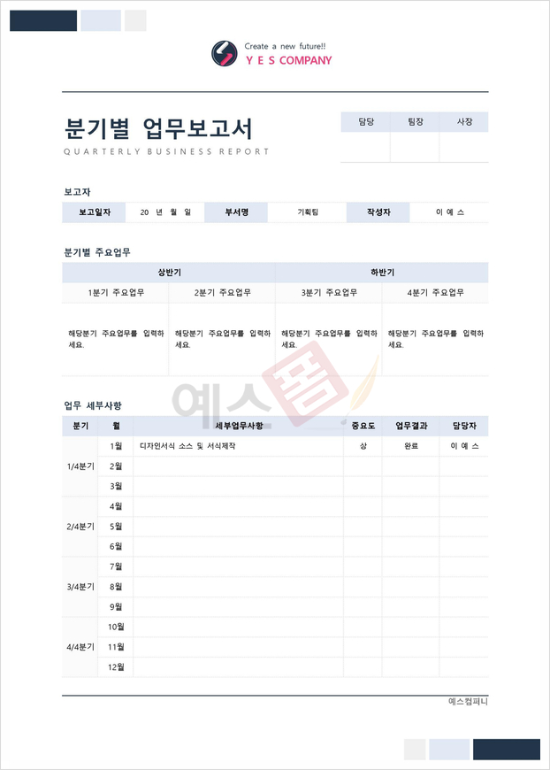 분기보고서나 실적보고서, 업무보고서 등 회사에서 사용하는 보고서 양식이 정해져 있다면 해당 양식에 맞춰서 보고서를 작성하면 되지만, 따로 정해진 양식이 없다면 어떤 회사의 보고서 양식을 참조해야 할지 헷갈리실 텐데요. 처음부터 새로 작성하기에도 시간이 너무 오래 걸릴 것 같아 난감한 직장인 분들을 위해 예스폼에서 다양한 분기보고서 양식을 서비스하고 있습니다. 아래 보고서 양식을 우리 회사의 사업과 나의 업무에 맞게 편집하셔서 사용해 보시기 바랍니다.