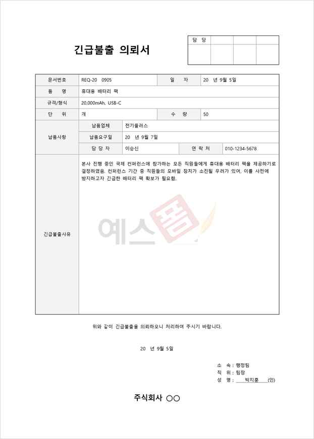 긴급불출 의뢰서(배터리 불출) - 기업 표준서식