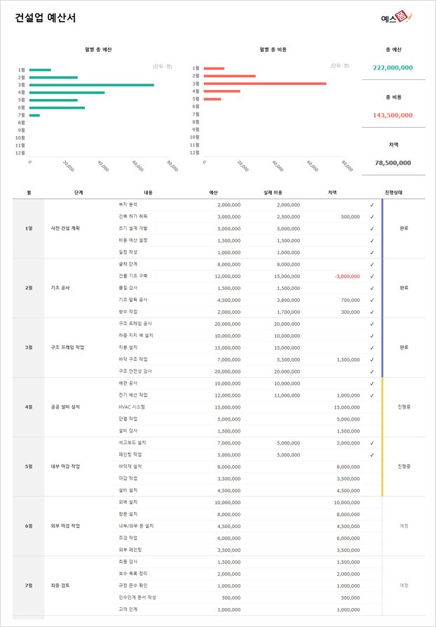 건설 프로젝트를 실행하는 동안 매월 소요되는 비용을 계획하고 관리하기 위한 건설업 예산서 양식입니다. 프로젝트의 모든 단계와 활동에 대한 월별 비용을 상세히 나열하여 프로젝트의 재정 상태를 효과적으로 모니터링할 수 있습니다.