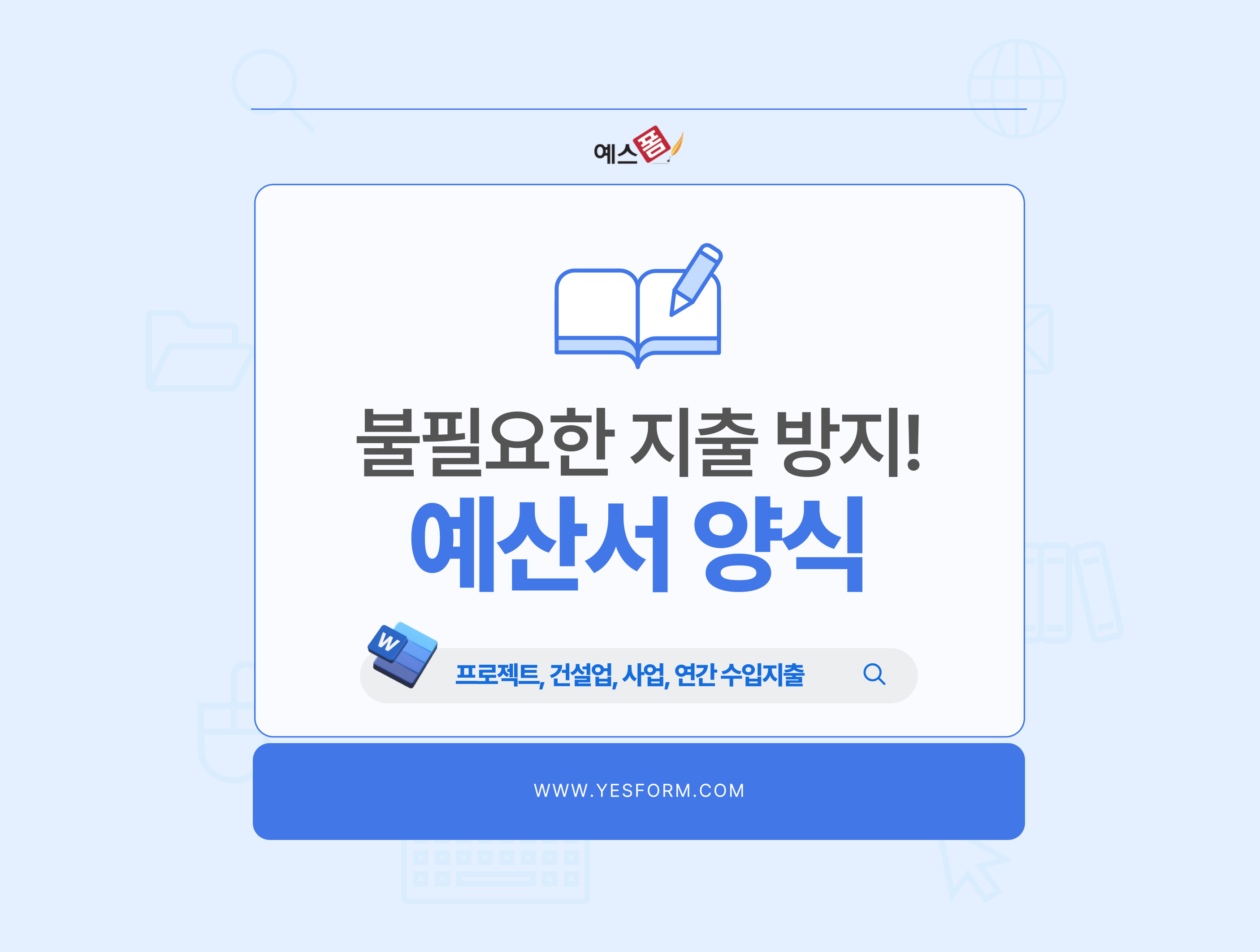 새로운 사업, 프로젝트를 시작하거나 기존 사업을 확정하려는 분들은 예산에 대해 고민해 보셨을 텐데요. 정확한 예산 산정은 매우 중요합니다. 정확한 예산 산정이 되지 않는다면 프로젝트 지연, 크게는 예상치 못한 손실로 이루어질 수 있기 때문입니다. 예스폼에서는 사업, 프로젝트를 준비하시는 분들을 위해 이번에 예산서 양식을 업데이트하였는데요.