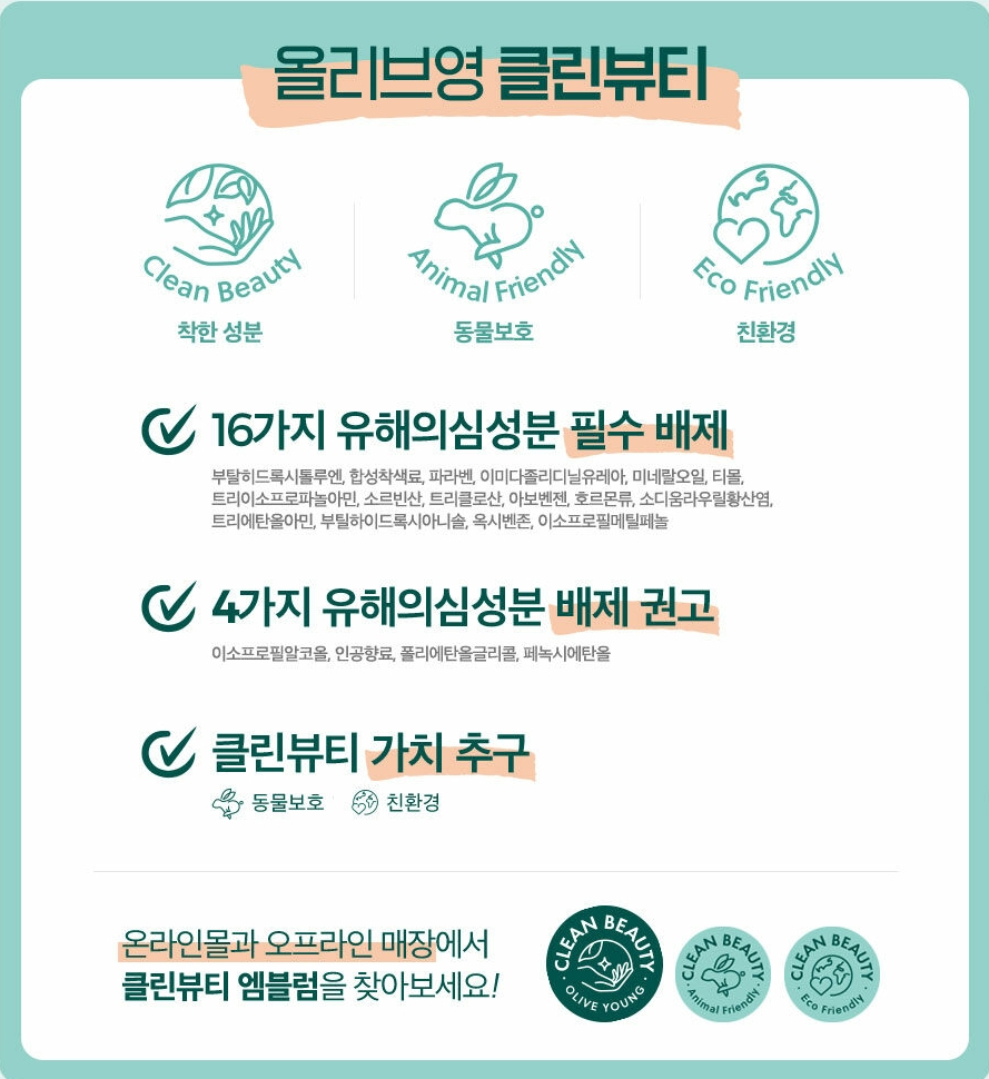 비건 화장품 시장의 규모는 2020년 기준 약 153억 달러로 매년 대략 6.3%의 성장률을 지속하고 있습니다. 화장품 업계들의 추세를 살피면 확실하고 뚜렷하게 증가하고 있는 시장입니다. 사실 비건 화장품이나 제품이 많더라도 소비자가 인지하지 못한다면 접하기 어렵고 비건 제품에 대한 의미를 갖기 어렵습니다. 이러한 비건 화장품 시장의 영향을 키우기 위해 우리가 흔하게 접하는 올리브영도 자체적인 클린뷰티 기준을 세워 클린뷰티에 해당하는 브랜드에 더 많은 혜택과 기회를 제공하고 있습니다. 클린 뷰티가 100% 비건은 아닐지라도 유통사의 노력으로 소비자들이 더 빠르게 접할 수 있게 되었다고 보고 있습니다.