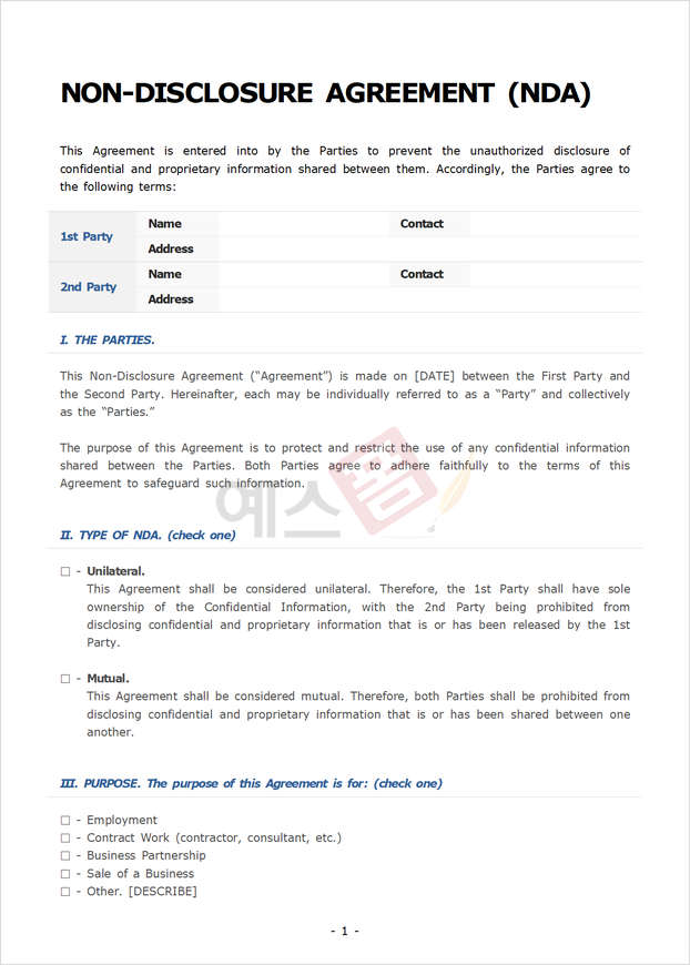 비밀유지 계약서(NDA)는 비즈니스에서 필수적인 문서 중 하나로, 중요한 정보 보호를 위해 사용되는 계약서입니다. 기업 간 협력, 투자 유치, 프로젝트 진행 시에 NDA 계약서를 잘 활용하면 민감한 정보를 안전하게 지킬 수 있는데요. 하지만 NDA를 처음 접하는 분들은 비밀유지 서약서가 왜 필요한지, 어떤 상황에서 사용해야 하는지 등 여러 가지 궁금증이 있을 수 있습니다. 오늘은 비밀유지 계약서란, 비밀유지 계약서 법적 효력에 대해 알아보고 예스폼에서 업데이트된 비밀유지 계약서 양식 비밀유지 계약서 예시 소개를 드릴 예정입니다. 비즈니스 필수 문서인 NDA의 의미와 필요성을 쉽게 이해해 비밀유지 서약서에 대한 이해를 높이고 필요할 때 올바르게 활용해 보세요!