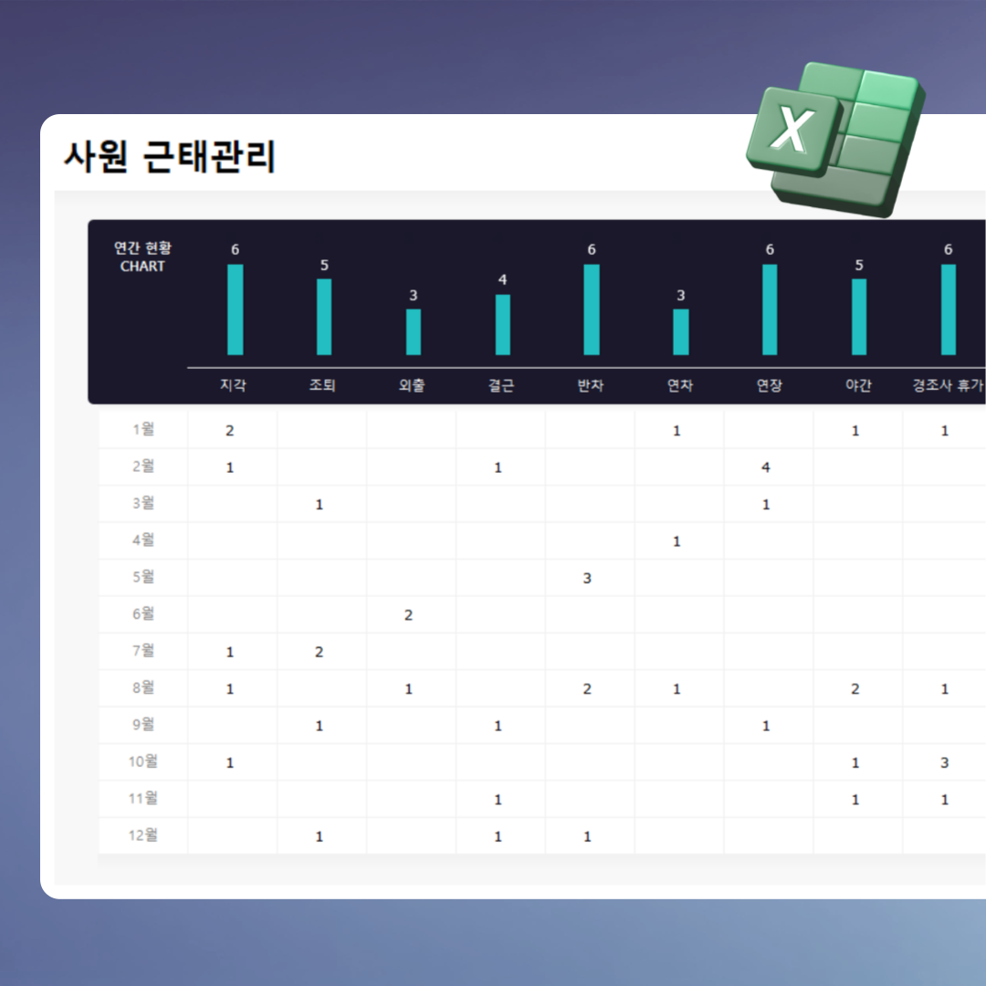 사원 및 부서의 근태내역을 관리할 수 있도록 제작된 사원 근태관리 엑셀템플릿입니다. 사용자가 직접 근태항목을 설정할 수 있으며, 설정된 항목에 따라 월/연간 근태현황을 전체, 사원/부서별