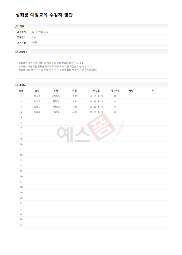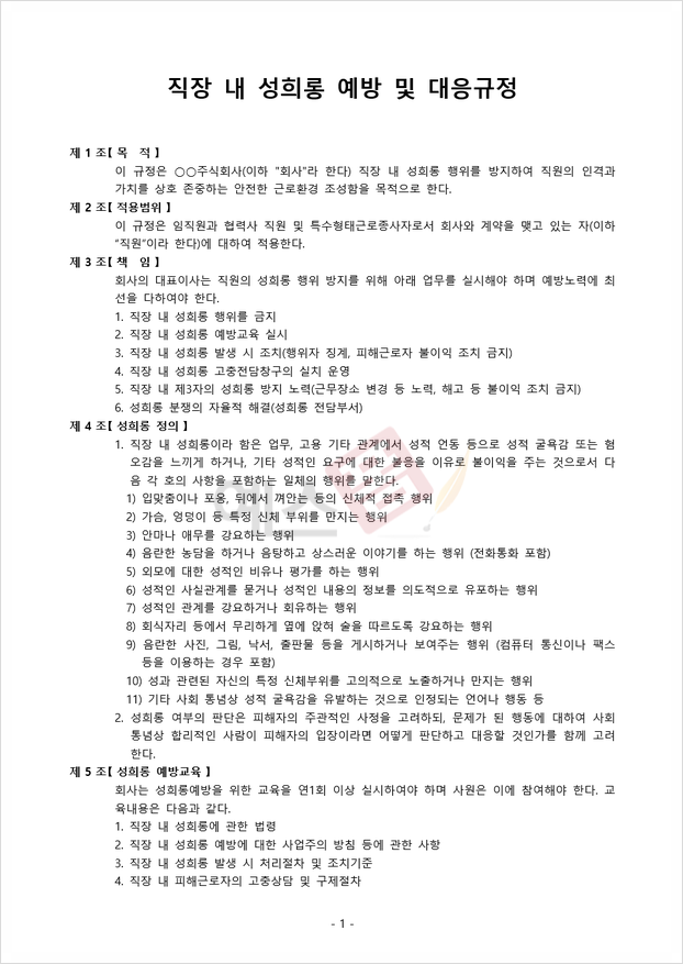 | 표준취업 규칙 | 성희롱 예방교육 수강자 명단 | 직장 내 성희롱 예방 및 대응규정 |